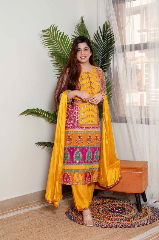 Out of StockVendor:LaGlitsSagari Yellow Printed Suit Set With Gotta Detailing