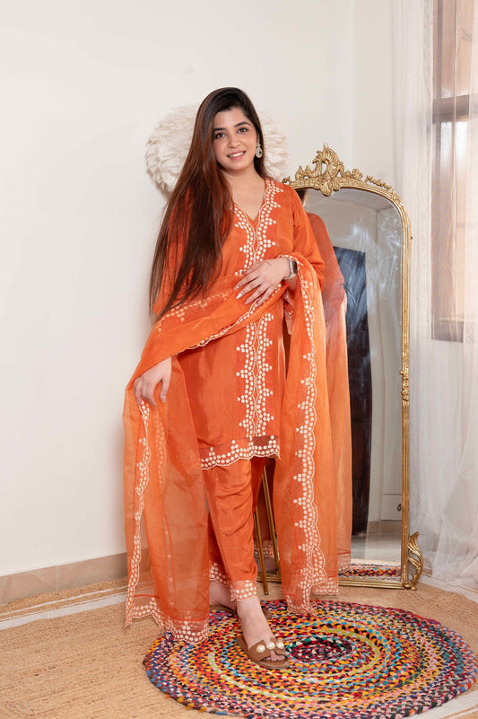 Sukh Rust Silk Suit Set With Schiffli Detailing