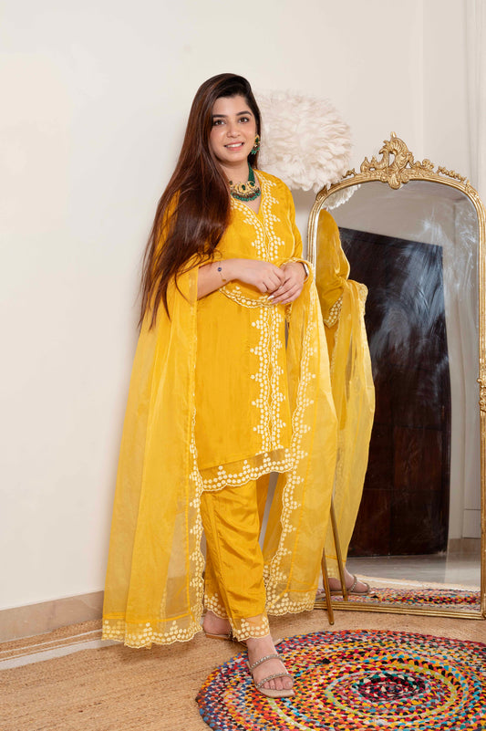 Sukh Yellow Silk Suit With Schiffli Detailing