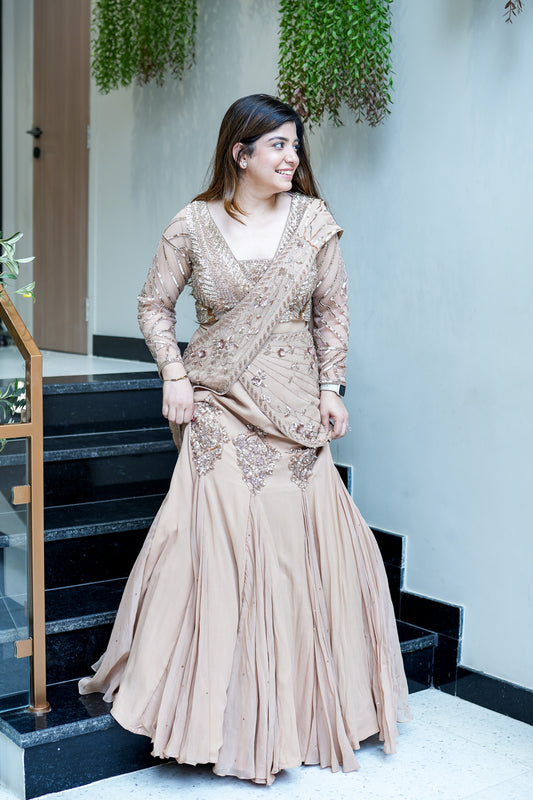 Viha Nude Embroidered Fish Cut Drape Saree