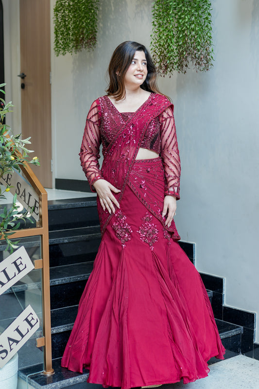 Viha Wine Embroidered Fish Cut Drape Saree