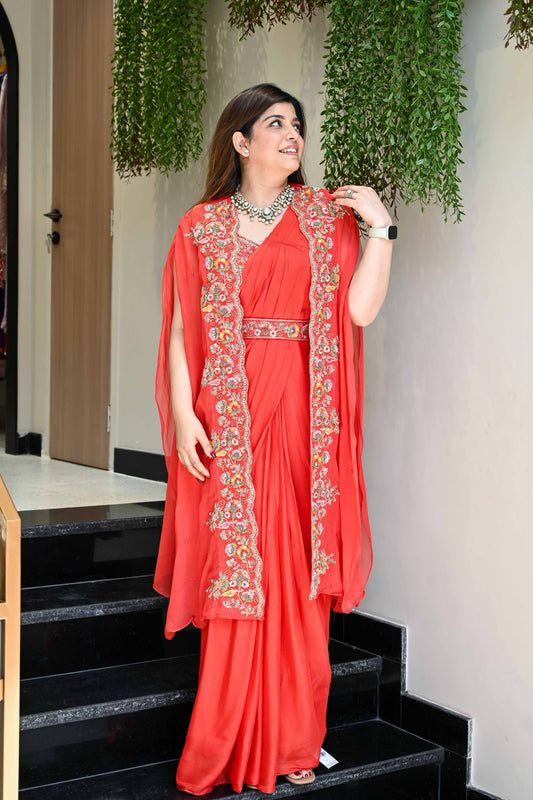 Keerna Orange Anarkali With Attached Dupatta And Cape