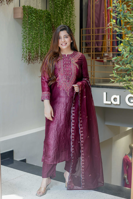 Out of StockVendor:LaGlitsSehra Wine Embroidered Suit Set
