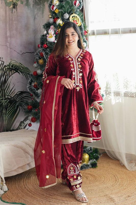 Simar Maroon Velvet Embroidered Suit without Potli Bag