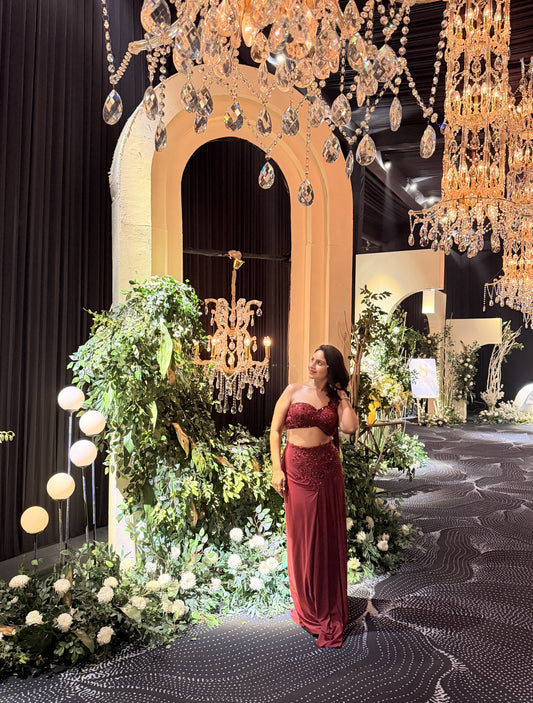 Fira Wine Crystal Embellished Corset Drape Saree