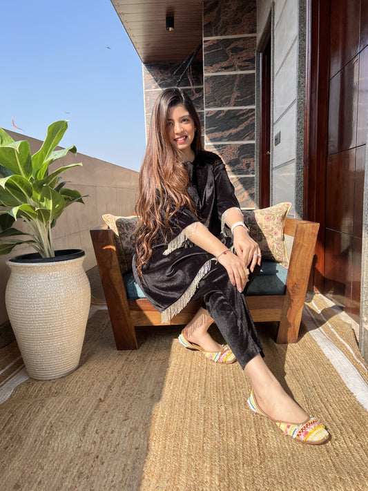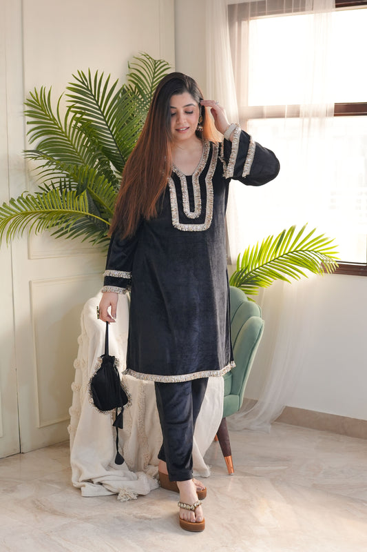 Meerza Black Velvet Plazo Set With Potli