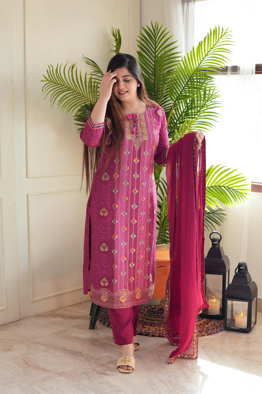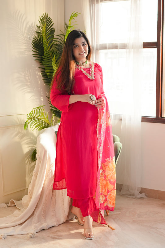 Out of StockVendor:LaGlitsIshrat Red Suit Set With Floral Dupatta