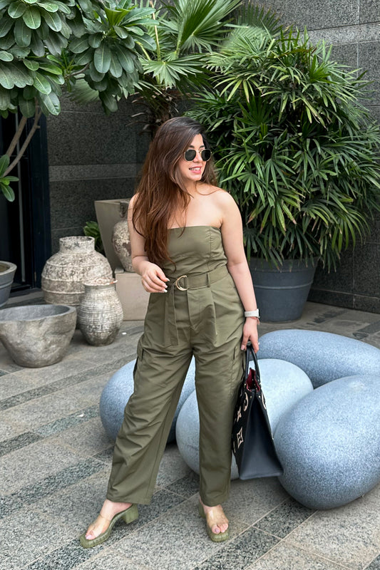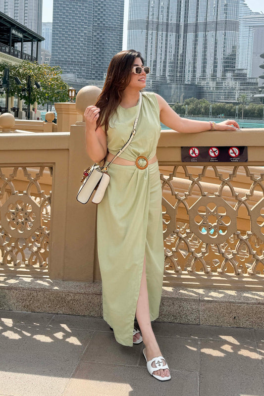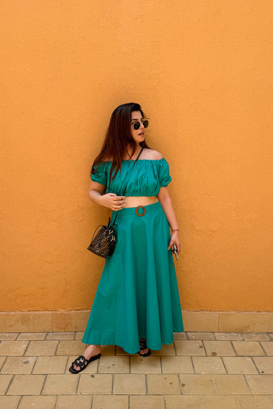 Carrie Green Poplin Crop Top and Skirt Set with Belt
