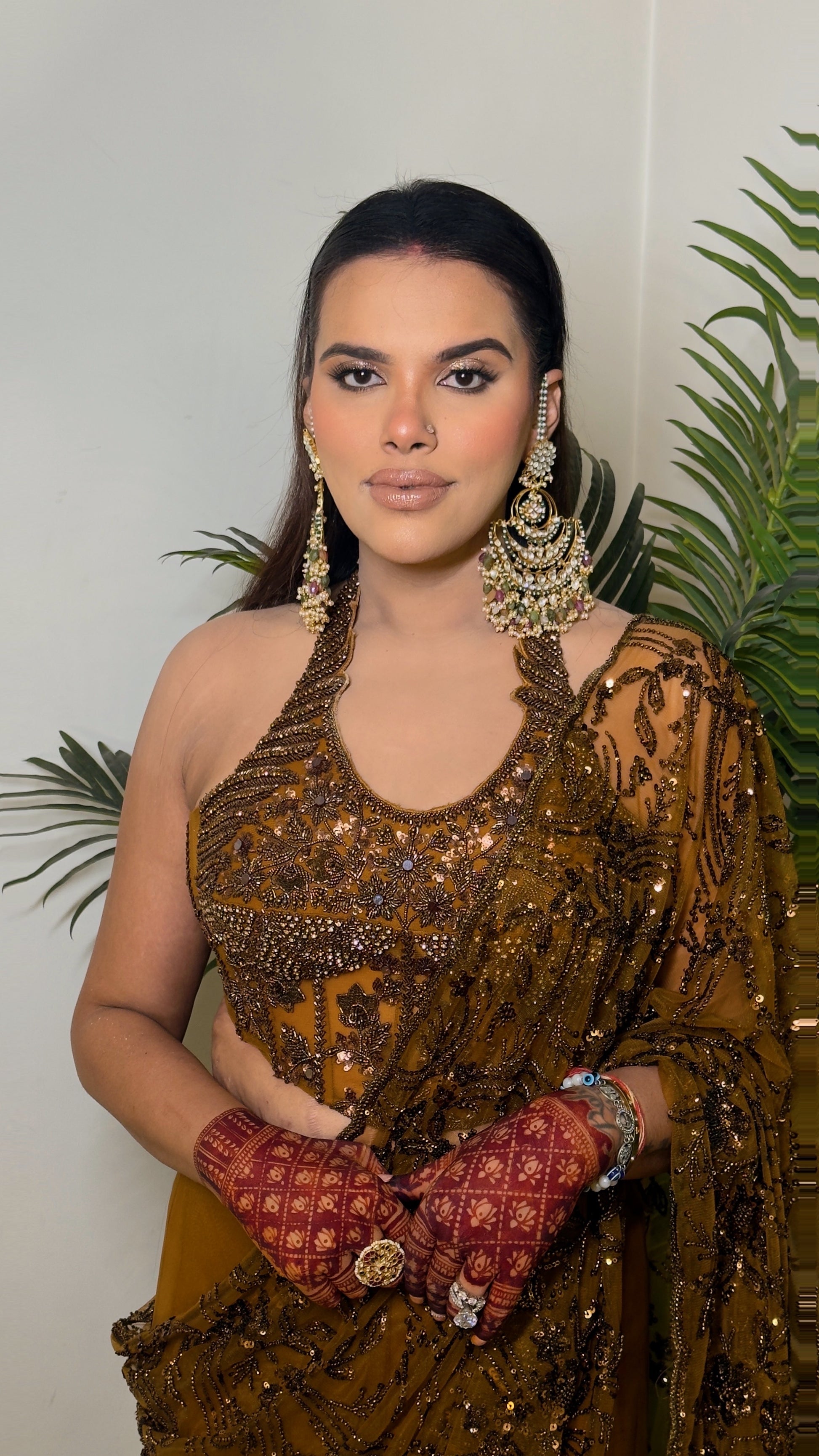 Fully Hand Embroidered Halter Neck Blouse with Drape Saree,