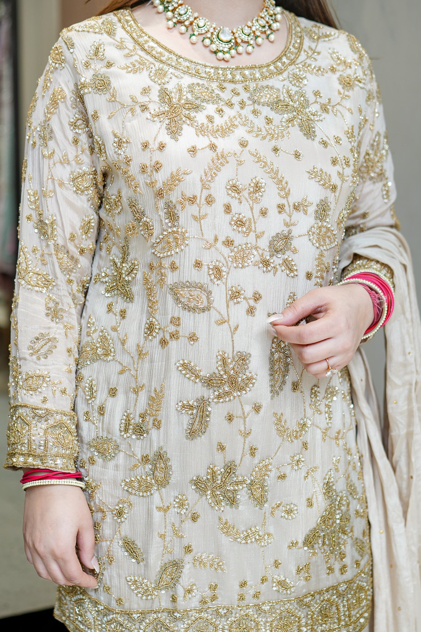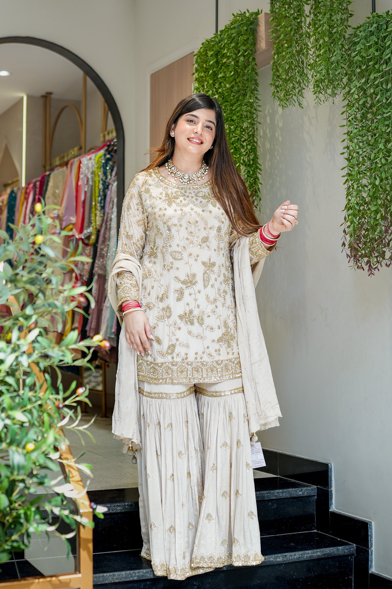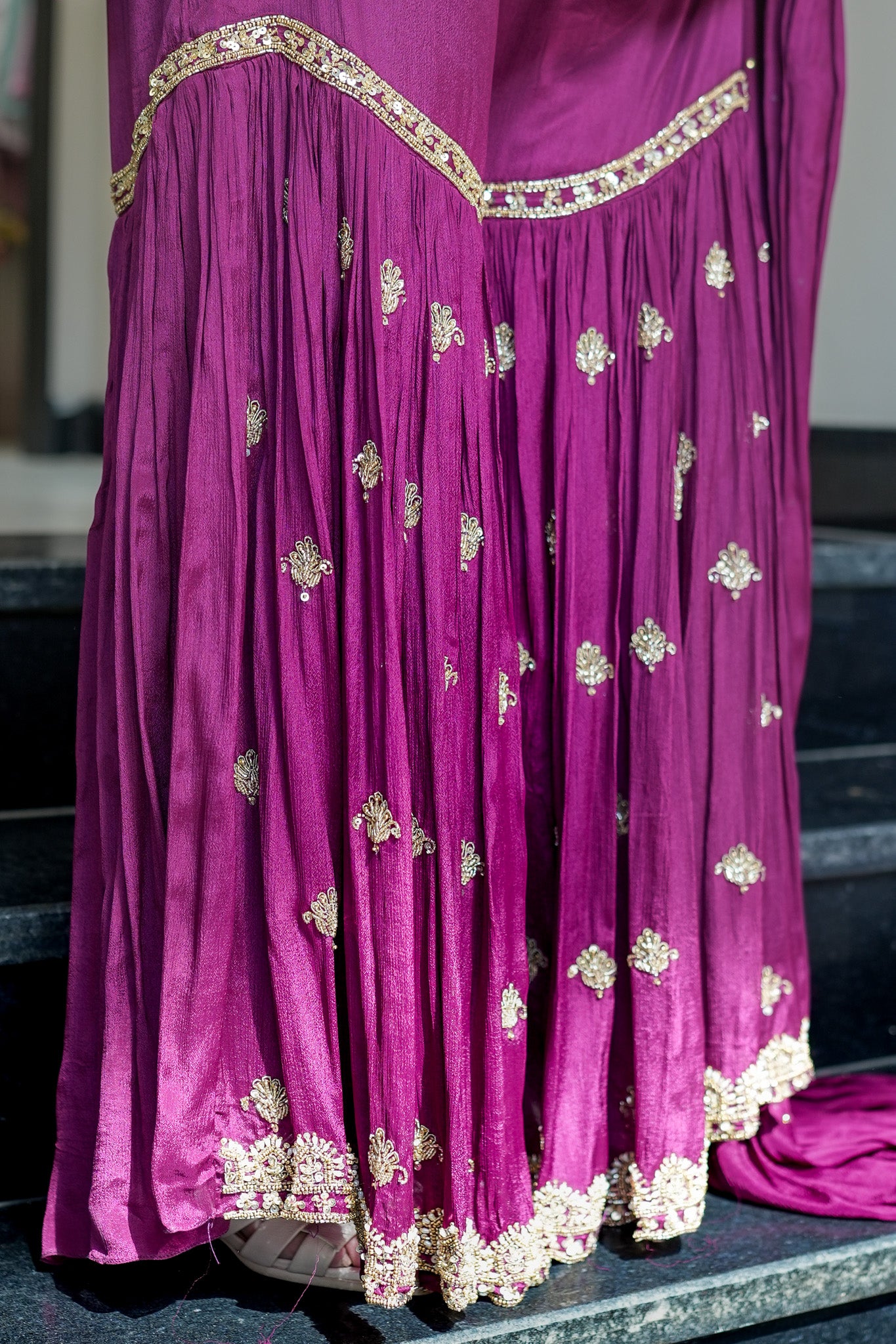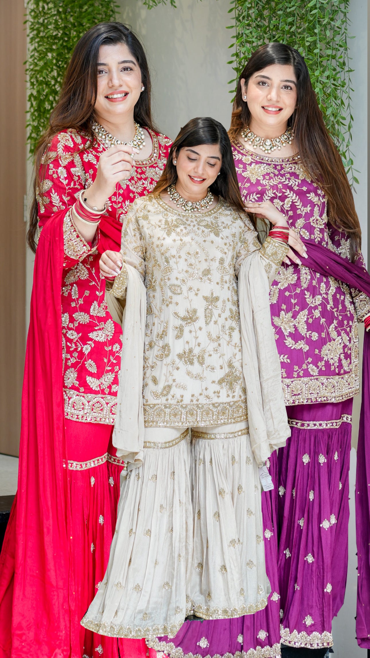 Fully Hand Embroidered Shararas, available in 3 beautiful colours.
