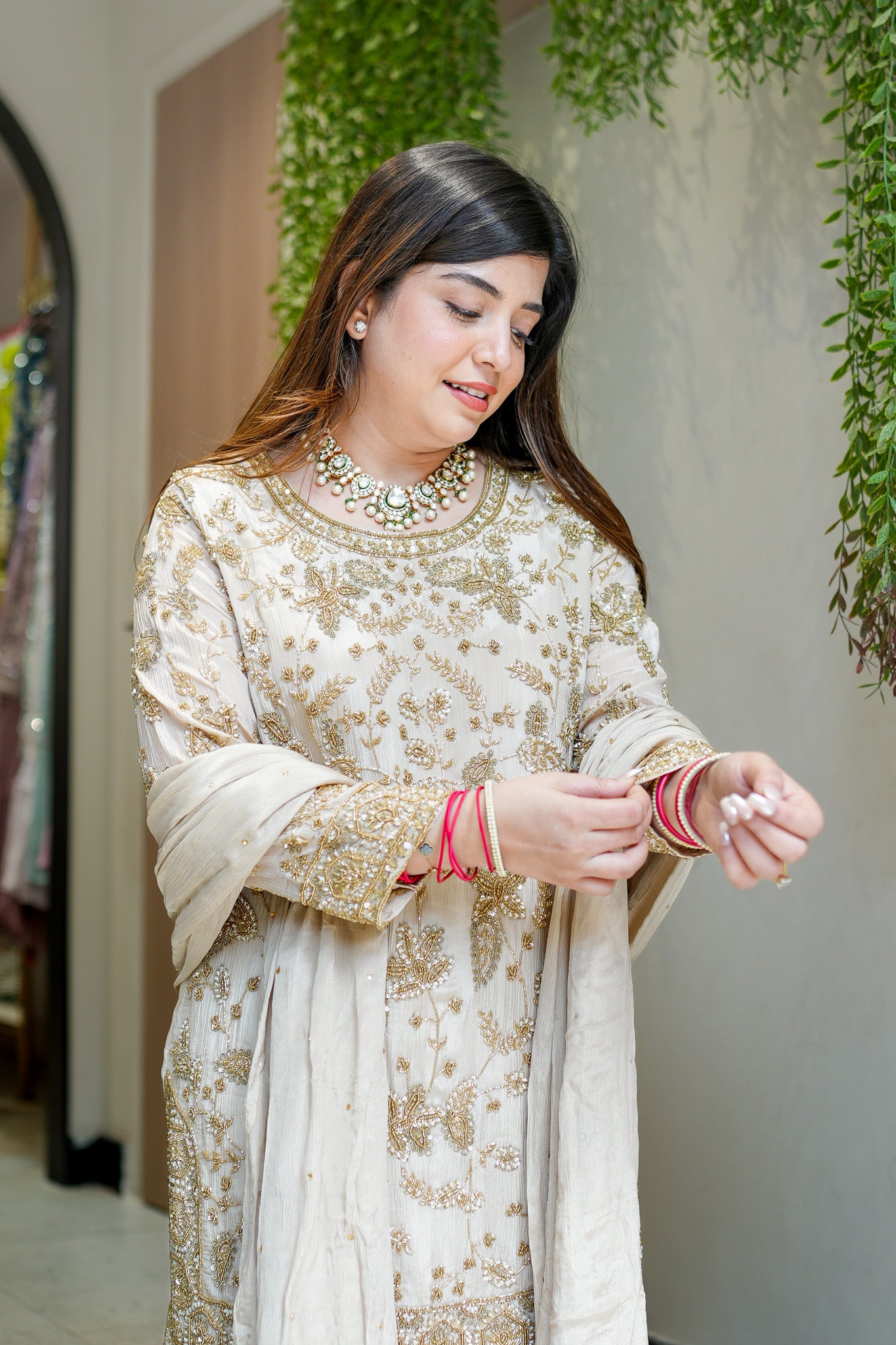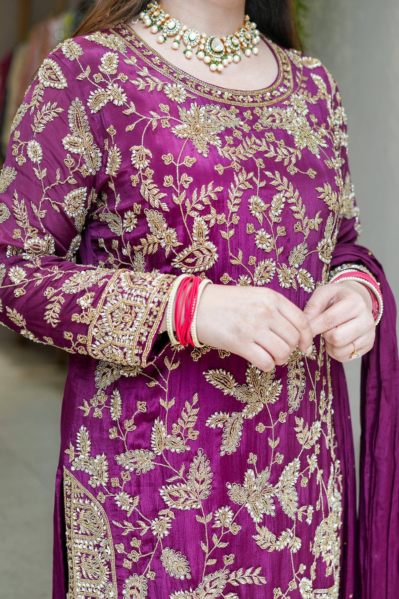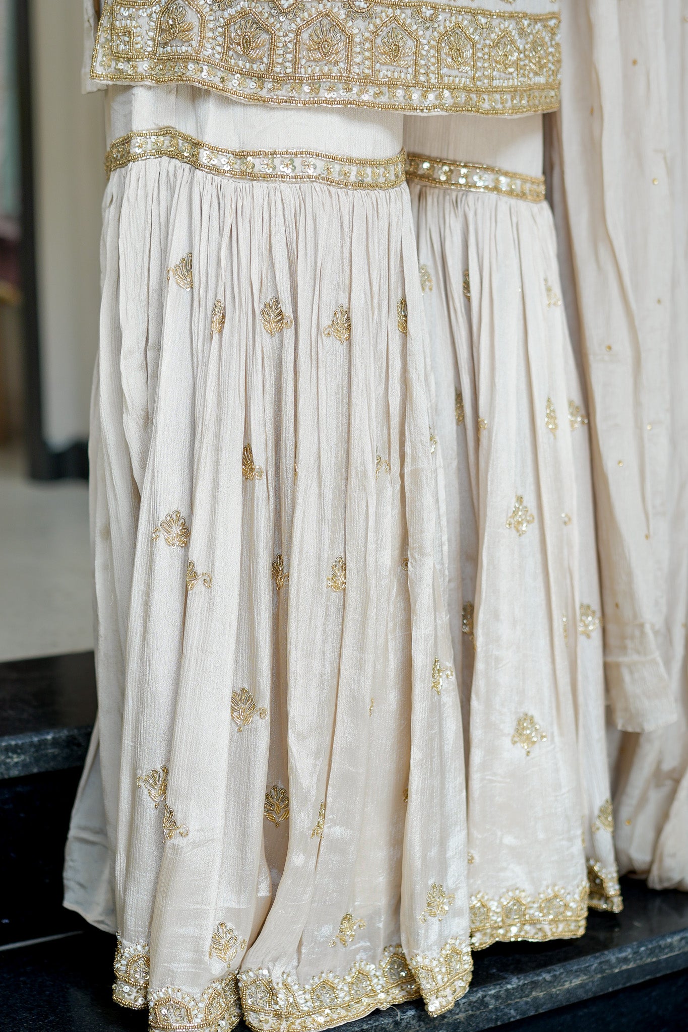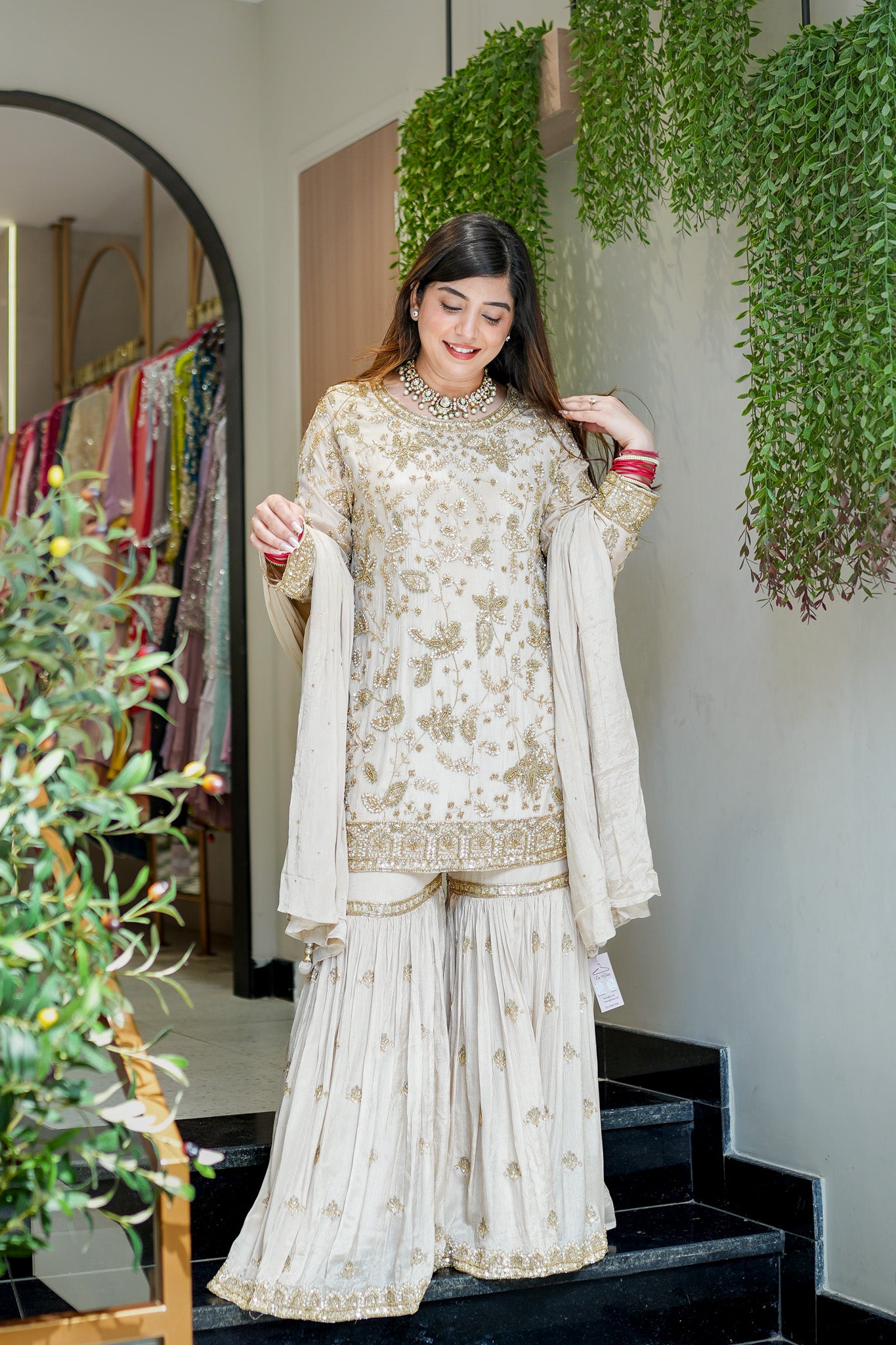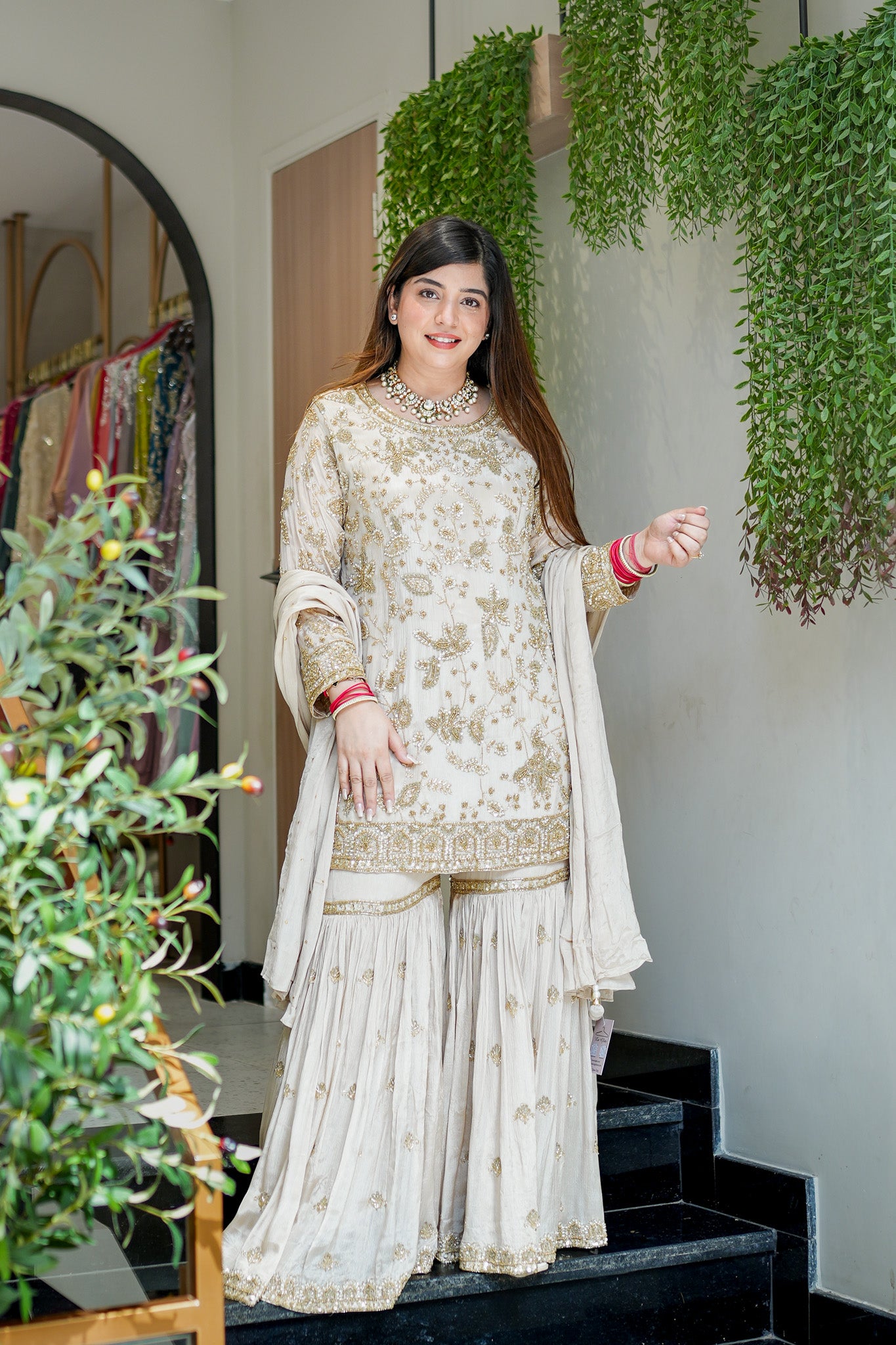 Fully Hand Embroidered Shararas, available in 3 beautiful colours.
